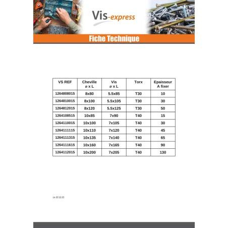 Cheville Longue Nylon 10X135 + Vis Tête fraisée TF TORX Acier zingué Autre références : 64103B10135