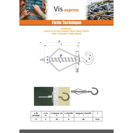 Cheville Nylon 8X40 Avec Crochet à collerette 4X45 Autre références : 3663072495210