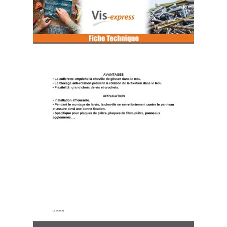 UGS : DMLZL 384293 Catégories : Cheville ancrage, Cheville Nylon Avec Vis bois Tête fraisée TF, Cheville pour plaque de plâtre