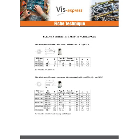 ECROU A SERTIR TETE REDUITE S/C M10 ACR ACIER ZING BLANC