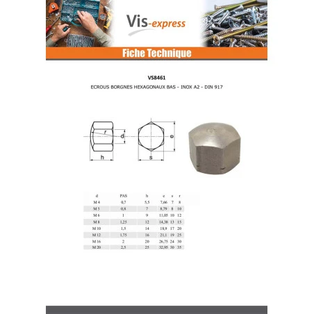 Ecrou Borgne Hexagonal BAS Inox A2 M20 Autre références : 62634