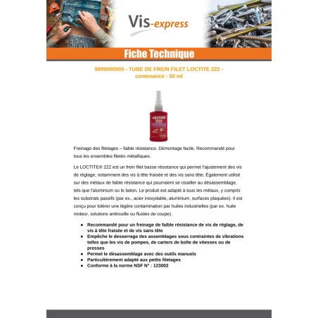 Frein filet FAIBLE RESISTANCE 50ML LOCTITE 222 Autre références : LOCTITE 222