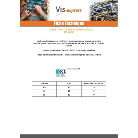 UGS : DMLZL 383337 Catégories : Cheville ancrage, Fixation Pour Béton, Fixation Pour Charges lourdes, Vis béton Tête hexagonale TH Inox A4