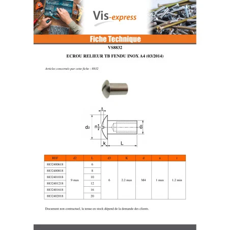 1 X Écrou Relieur Tête Fraisée Bombée TFB Moletée M4X13 5X20 Laiton