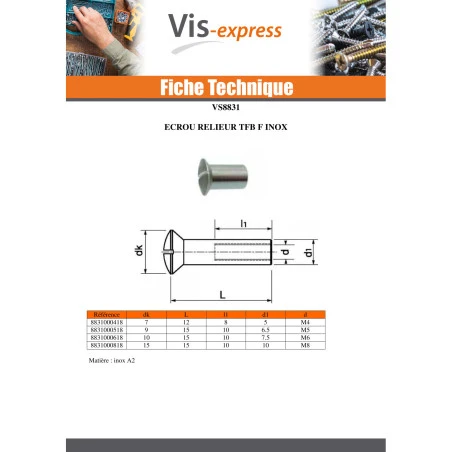 Diametre = M8, Longueur = 10, Famille Sous Produits = Tete fraisee bombee, Matiere = Inox A2, Empreinte = Fendu, Diametre Tete = 15
